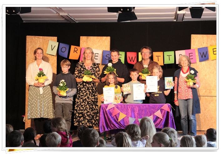 Die Jury, bestand aus: Frau von Bernstorff, Frau Vey, Herrn Scharwächter, Leonard Wilkens (Vorlesesieger aus der OBS), Liam Schofield (Schülersprecher der OBS) und den 1. Klassen. Gemeinsam haben sie in unterschiedlichen Kategorien Stimmen abgegeben. Es war ein sehr enges Rennen, weil alle Kinder wirklich toll vorgelesen haben!
